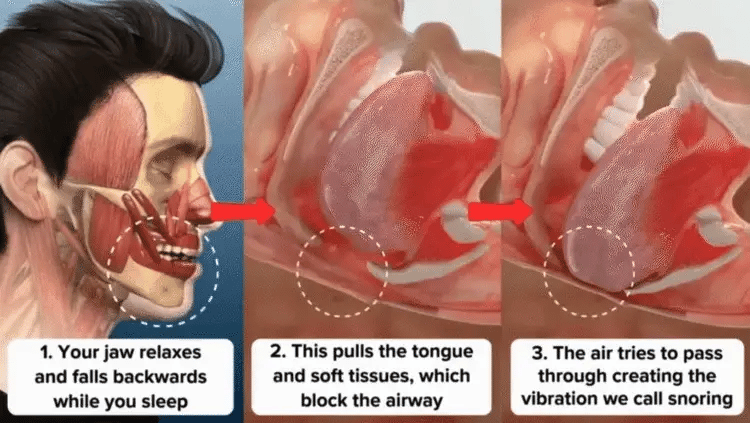 Snoring happens when the muscles in your throat relax during sleep, narrowing your airway and causing vibrations. The