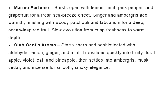 Marine Perfumeis your move for daytime walks, rooftop lunches, or intimate coffee meetups—its crisp citrus and sea-breeze freshness makes you feel approachable, inviting her to lean closer, to stay in your space a little longer.Club Gent’s Aromais made for after-dark—bars, parties, or candlelit dinners—its fruity-floral heart and smoky-woody base linger in the air, sparking curiosity, holding her gaze, and leaving a trace she can’t forget. Two fragrances, one goal: to turn every glance into a spark, and every spark into something more.